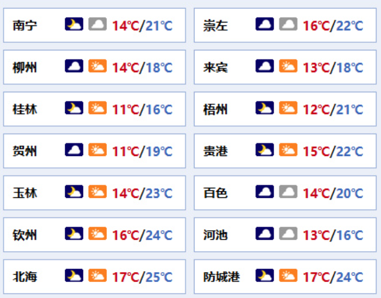 南宁市:多云到阴天、局地有小雨,东北风2~3级,最低气温14℃,最高气温21℃。