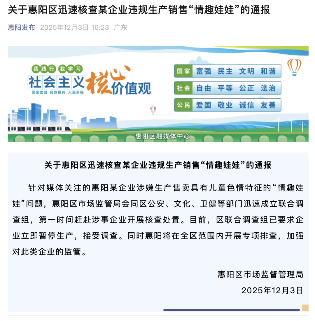 12月3日,广东省惠州市惠阳区市场监督管理局通报称,针对媒体关注的惠阳某企业涉嫌生产售卖具有儿童色情特征的“情趣娃娃”问题,多部门已成立联合调查组赶赴涉事企业开展核查处置。目前,已要求企业立即暂停生产,接受调查。(点击查看详情)