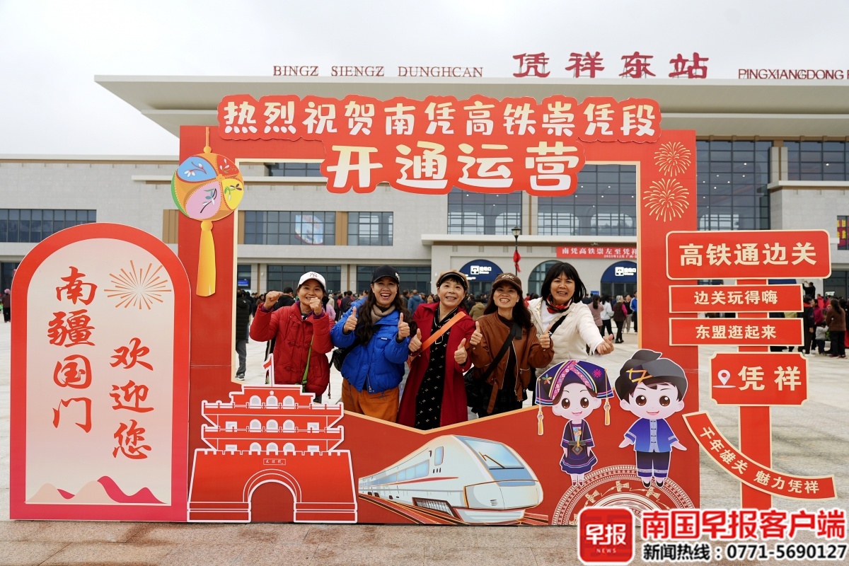 上午10时18分,凭祥东开往南宁东的D9668次列车准时发车,这是南凭高铁全线开通运营后开出的首趟高铁列车。越南客商林释襄和三名朋友登上列车,她们在凭祥浦寨做红木生意已有20多年,打算前往崇左太平古城景区游玩。