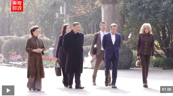 初冬的都江堰,苍山掩翠。马克龙夫妇抵达时,受到习近平和彭丽媛热情迎接。两国元首夫妇沿堰功道边走边谈。习近平介绍都江堰历史和意义,指出都江堰水利工程是全世界迄今唯一仍在使用的古代水利工程,也是人类与自然和谐共生最早的成功实践之一,修建过程充分反映了中华民族自强不息、不畏艰难、勇于开拓的精神。两国元首夫妇落座怀古亭,临水品茗,纵论天下。