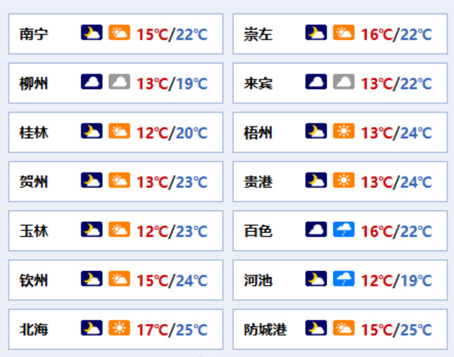 南宁市:多云、局地有零星小雨,偏东风1~2级,最低气温15℃,最高气温22℃。