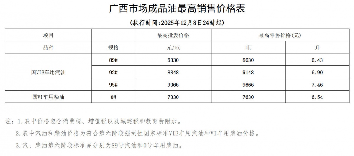 12月8日,南国早报全媒体记者从自治区发展改革委获悉,这次成品油价格调整后,广西国VIB标准89号汽油从6.47元/升调整到6.43元/升,每升下调0.04元;92号汽油从6.95元/升调整到6.90元/升,每升下调0.05元;95号汽油从7.51元/升调整到7.46元/升,每升下调0.05元;国VI标准0号车用柴油从6.58元/升调整到6.54元/升,每升下调0.04元。