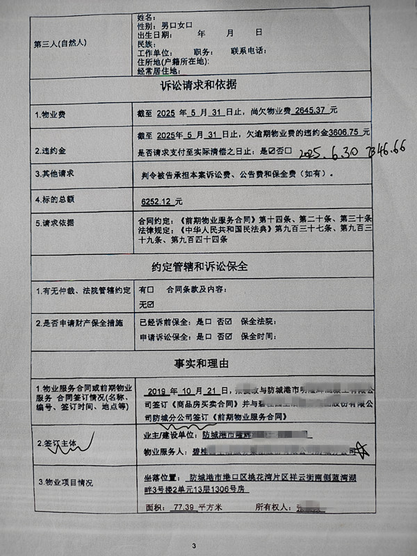 今年9月,小区物业公司以张女士拖欠物业费为由,向港口区人民法院提起诉讼,要求张女士补交物业费和违约金共6200余元。目前,法院已审理,正等判决。
