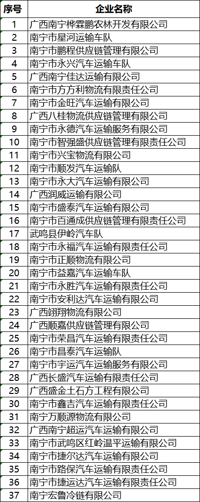 南国早报全媒体记者注意到,广西南宁桦霖鹏农林开发有限公司、南宁市星河运输车队、南宁市鹏程供应链管理有限公司、南宁市永兴汽车运输车队、广西南宁佳达运输有限公司等企业在列。