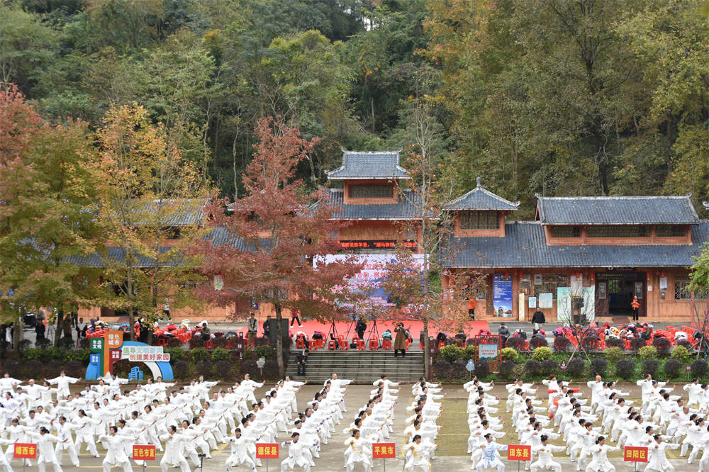 队员们身着统一服饰,在漫山红枫的映衬下,动作圆活连贯、刚柔并济,动静之间尽显太极“以意引气、以气运身”的独特韵味,将太极拳的柔和舒缓、太极扇的飘逸灵动展现得淋漓尽致。