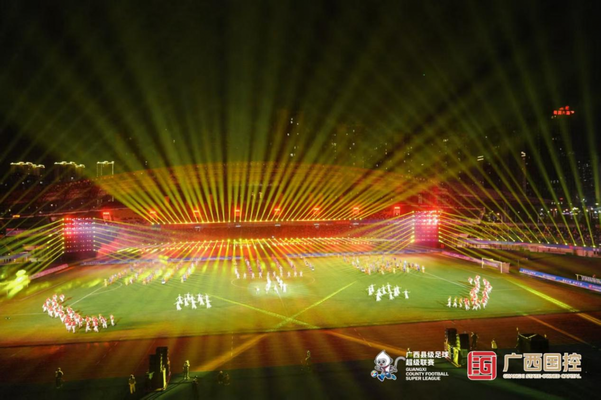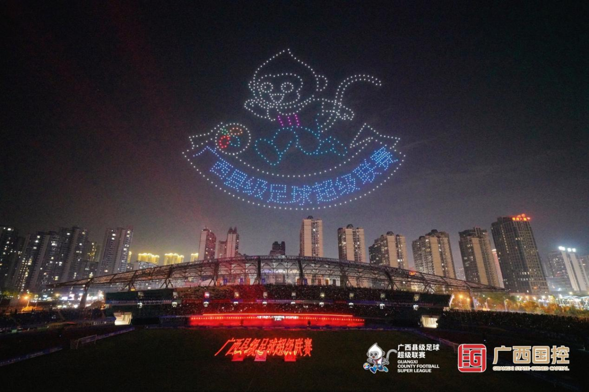 当日19时,《广西尼的呀》等广西民歌旋律在贵港市体育中心体育场响起,28支参赛队伍的队旗依次入场,2.6万名球迷热情涌入,瞬间点燃全场氛围。开幕式精彩纷呈,以多层次光影技术与舞蹈艺术结合,在现场还原荷花初绽、荷叶连波的唯美景致;千台无人机集群在夜空中动态勾勒铜鼓、绣球、荷花、广西“县超”等图形标识,地面则通过智能灯光与舞台视觉联动,打造沉浸式光影秀。此外,还有广西本土人气歌手献唱、体育名将助阵,传递出“全民足球、共享快乐”的核心理念。