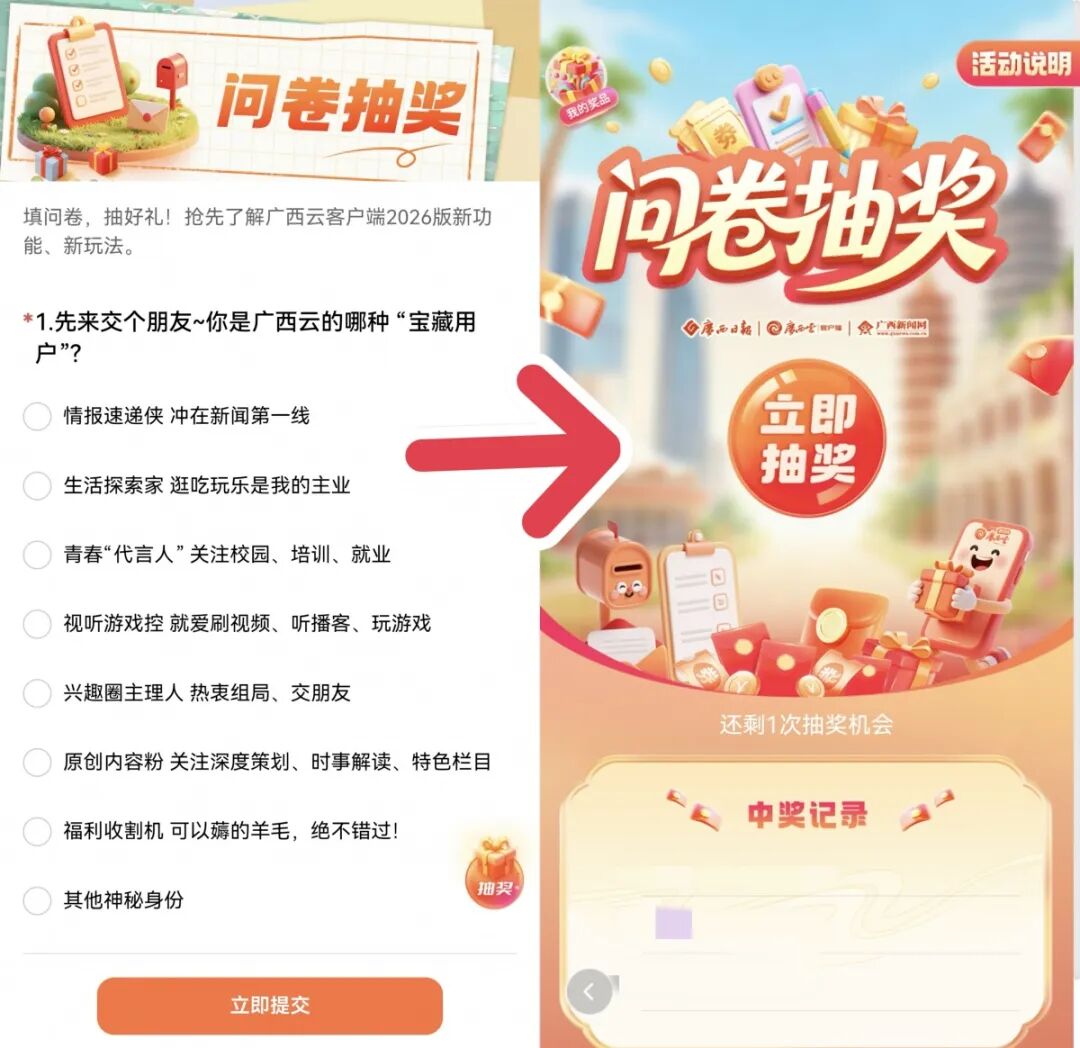 玩法:这是一份广西云客户端2026版的问卷,你的每一个建议和想法都很重要,提交后立即抽奖!