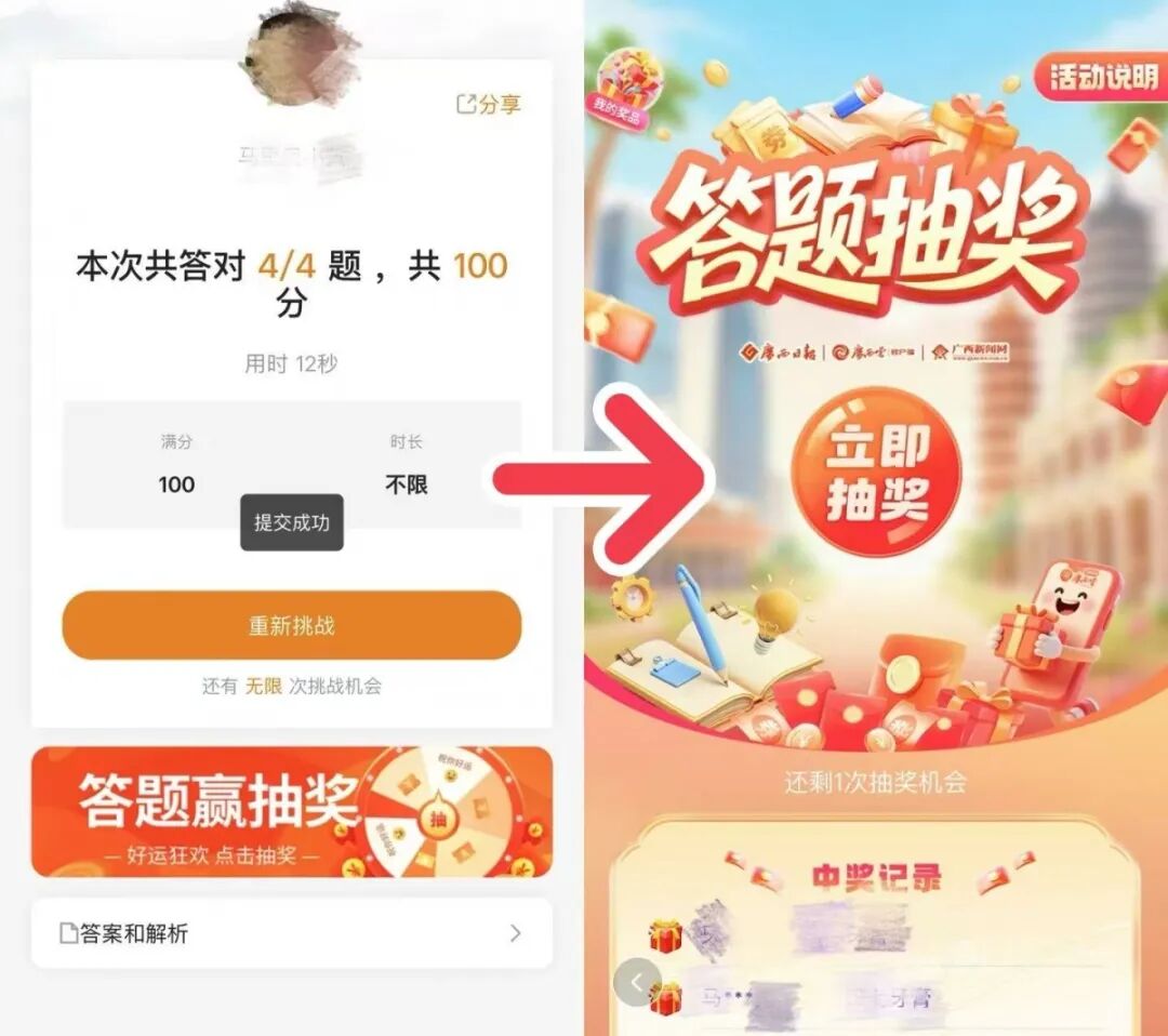 玩法:答题挑战,答对4题即可抽奖。看看你对广西云客户端了解多少,新老朋友们速来挑战!