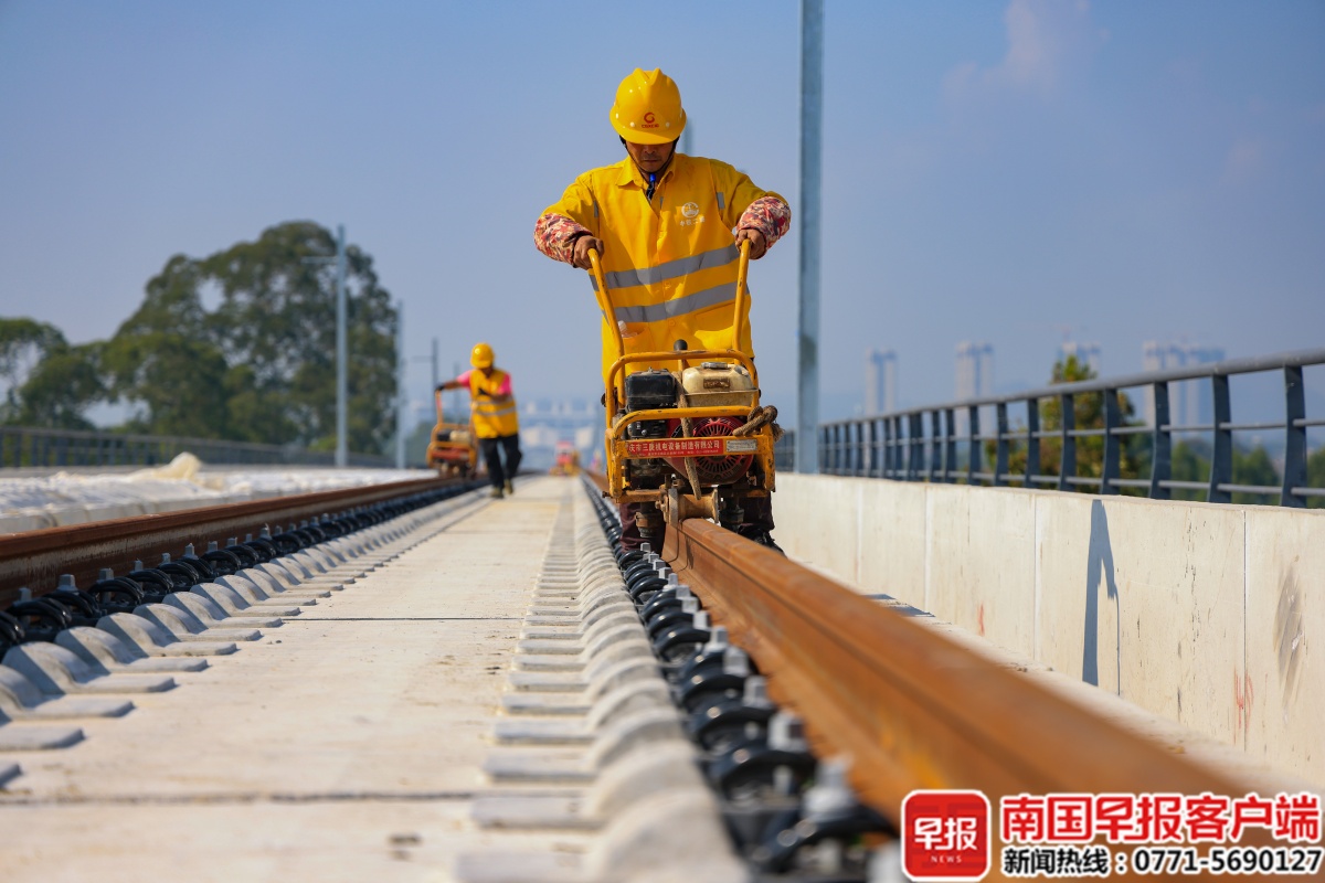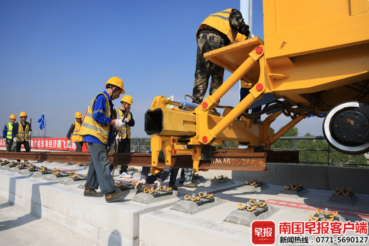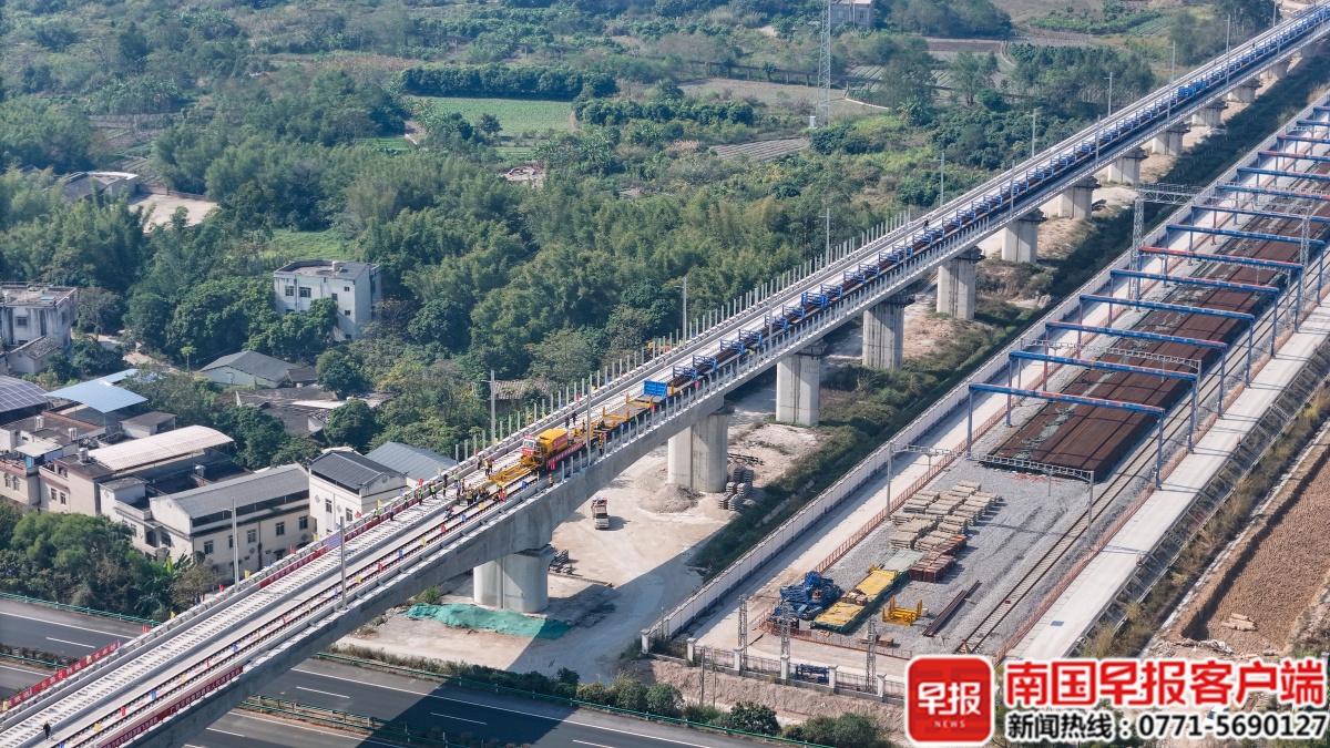 12月20日,在北流市境内的南珠高铁玉林北至岑溪东段铺轨施工现场,铺轨机将首对500米长钢轨平稳铺设在无砟道床上,标志着南珠高铁玉林北至岑溪东段进入全线铺轨阶段。