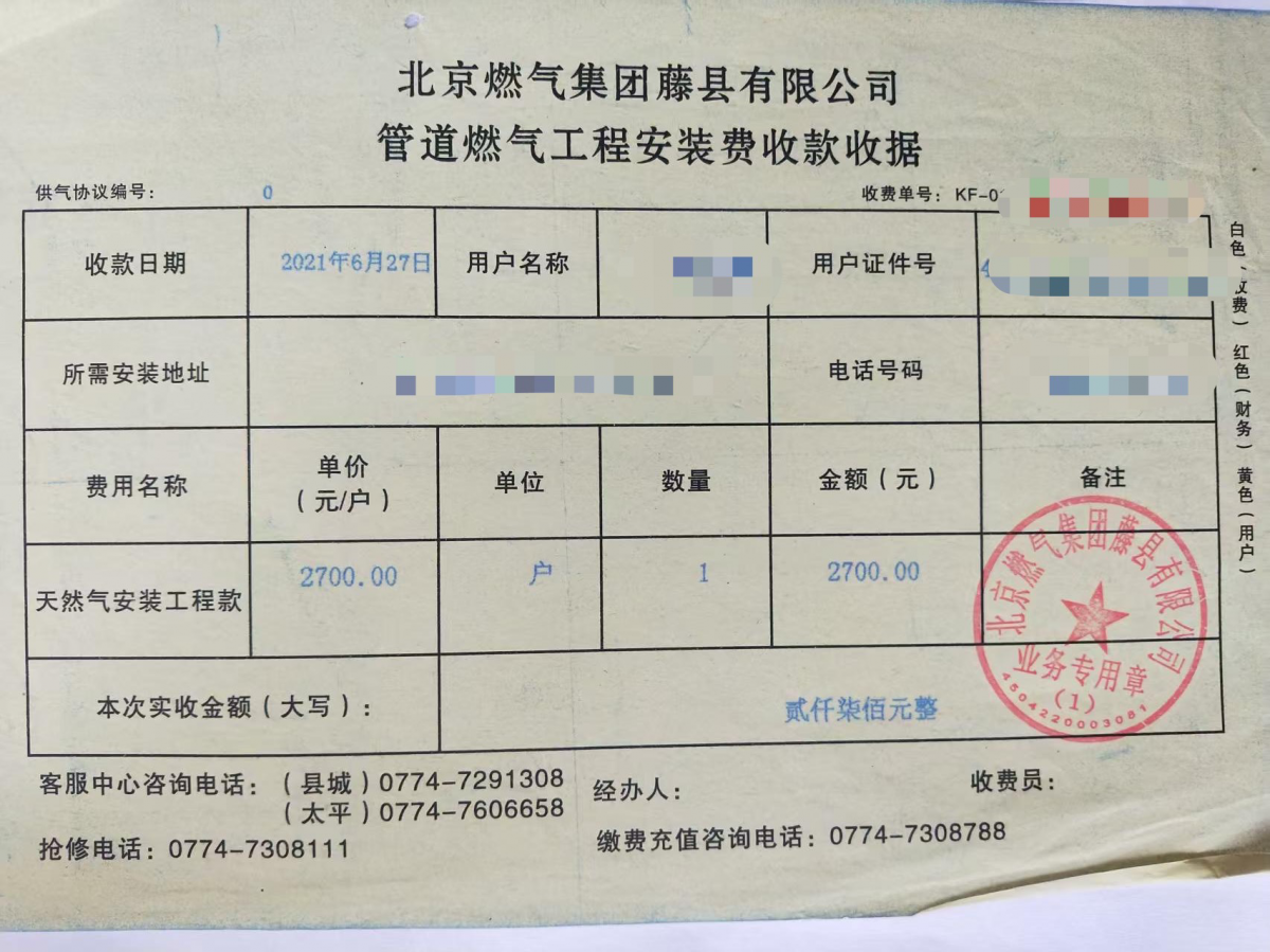 业主缴纳的燃气安装费收据。本文图片均由受访者提供