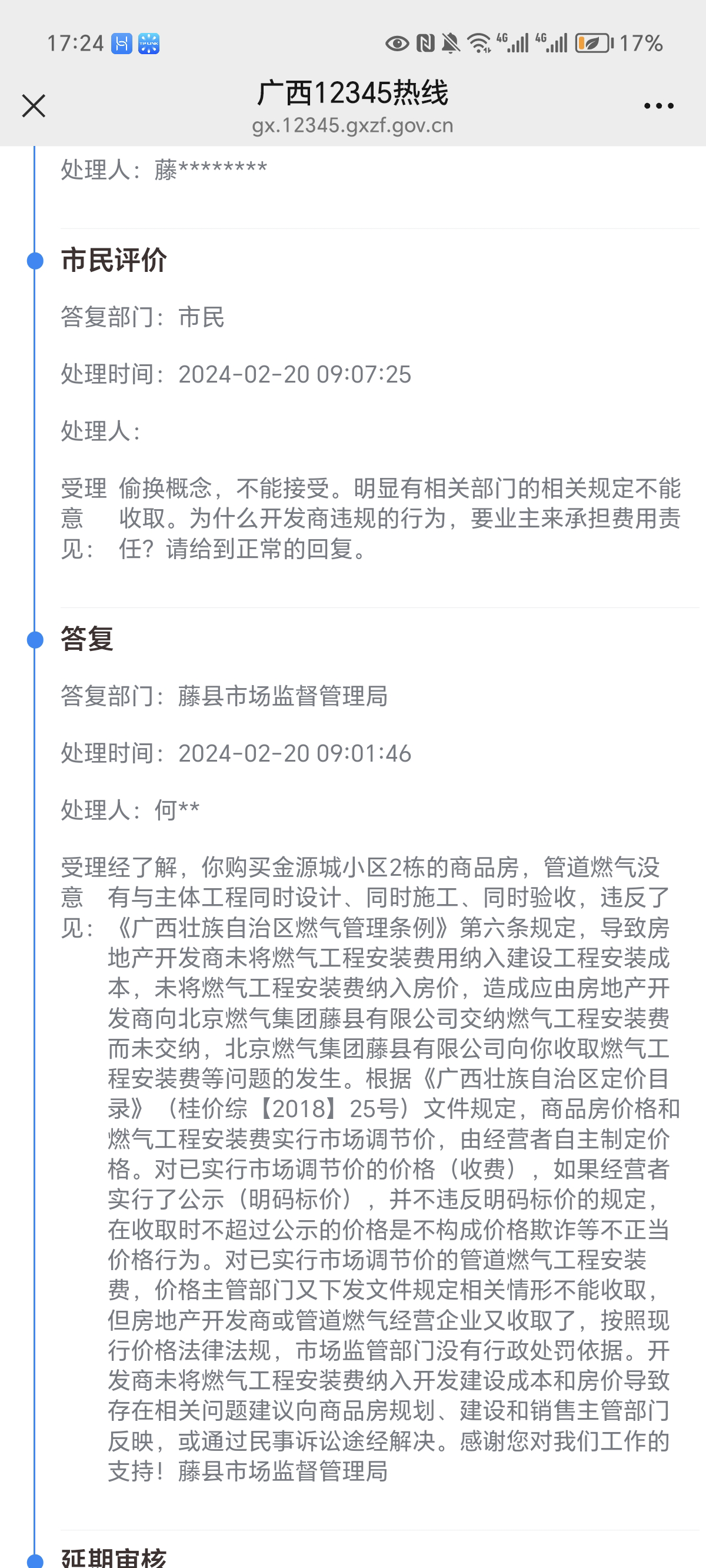 通气使用后,张雨等人偶然得知相关政策明确这笔费用不应由业主承担。2024年2月,该小区有业主向12345热线举报该项违规收费,藤县市场监督管理局回复称,由于该小区管道燃气与主体工程没有同步设计、同步施工、同步验收,违反了《广西燃气管理条例》第六条规定,导致开发商未将燃气工程安装费纳入建设工程安装成本,因此本应由开发商承担的燃气安装费未缴纳,北燃藤县公司转而向业主收取。