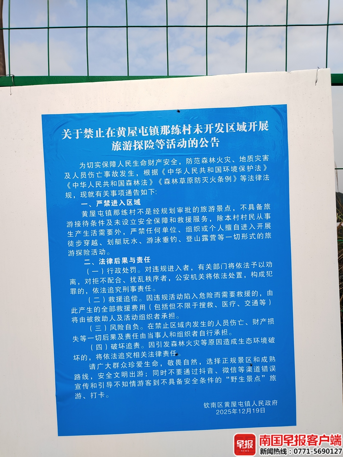 当地政府在围栏上张挂警示横幅。