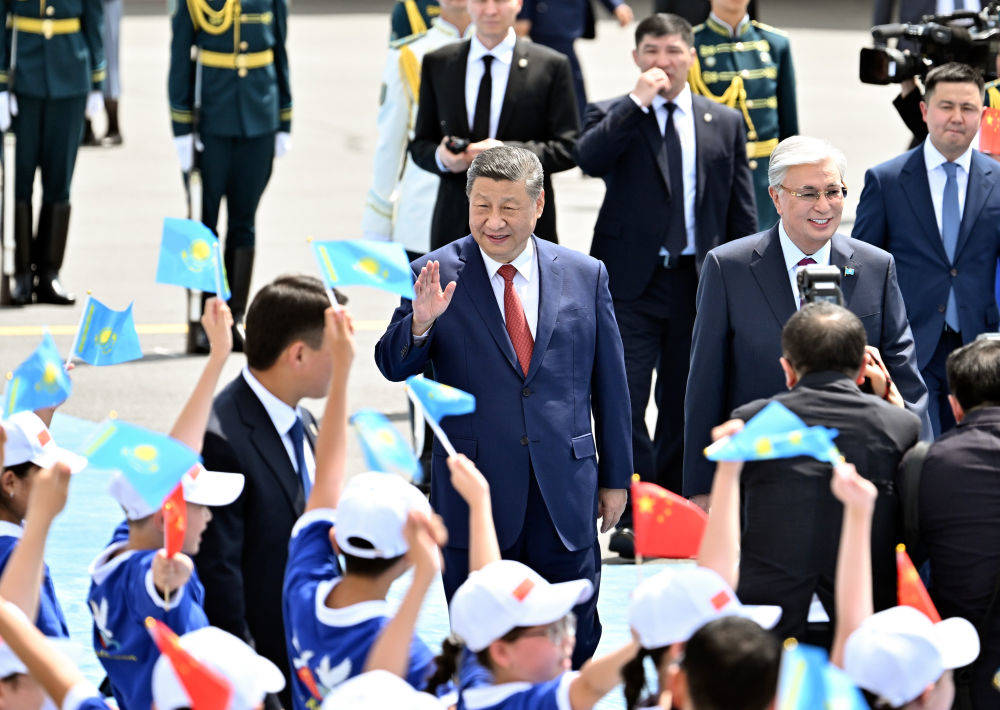 当地时间6月16日中午,国家主席习近平乘专机抵达阿斯塔纳,应哈萨克斯坦共和国总统托卡耶夫邀请,出席第二届中国-中亚峰会。这是习近平向欢迎人群挥手致意。新华社记者 殷博古 摄