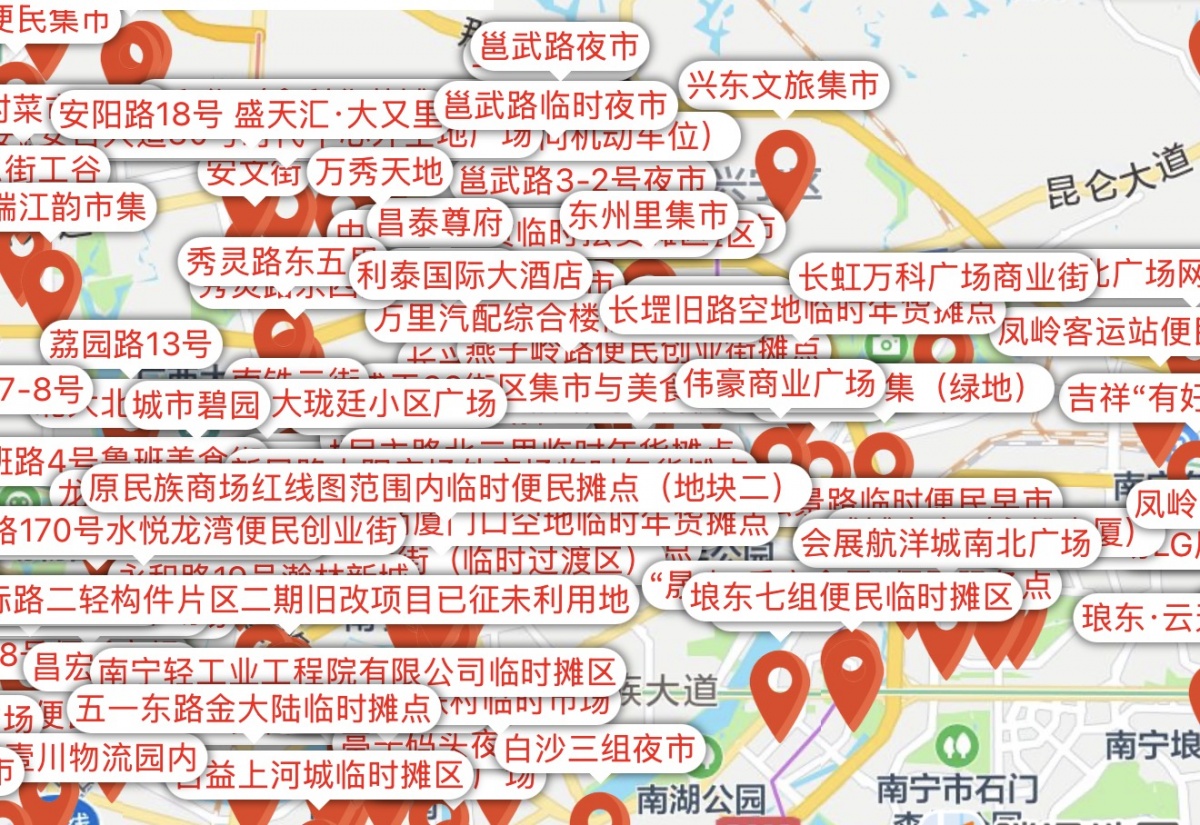 目前,南宁市共设置有临时便民集市207个,摊位14487个。南宁市市政和园林管理局研发的临时便民集市电子地图,旨在方便市民群众和摊主们点击链接,自行查询符合需求的便民摊位。据介绍,电子地图将根据临时便民集市动态管理情况不定期进行更新,市民和摊主可以查询到全市各临时便民集市的具体位置、经营业态、经营时段和咨询电话,需要咨询摊位事宜,可以打电话了解具体情况。