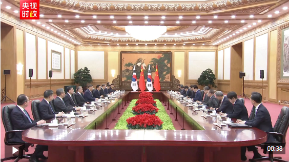 习近平指出,当前世界百年变局加速演进,国际形势更加变乱交织。中韩在维护地区和平、促进全球发展方面肩负重要责任,有广泛利益交集,应当坚定站在历史正确一边,作出正确战略选择。
