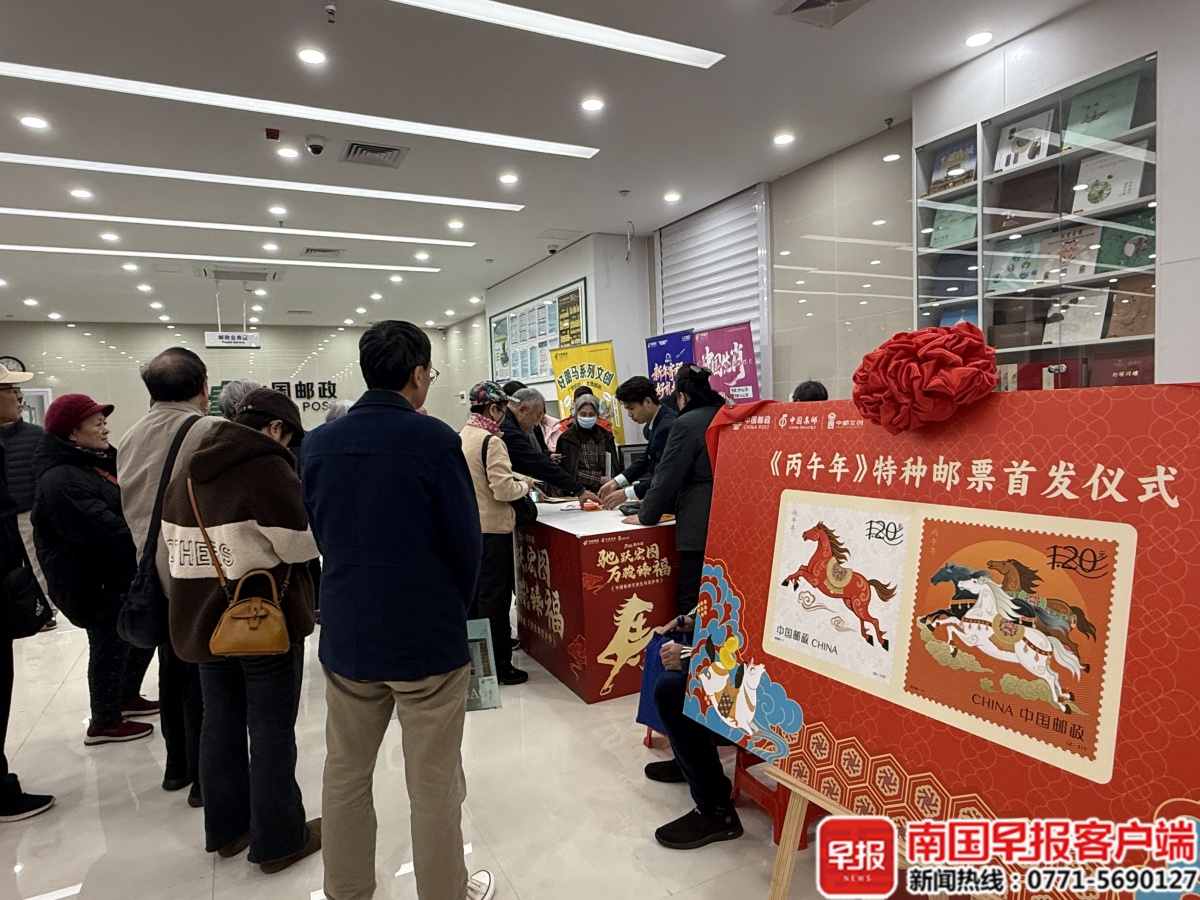 1月5日,中国邮政《丙午年》特种邮票正式开售,南宁各个邮政网点排起长队。据了解,有集邮迷凌晨4时就出门排队,只为尽快买到马年邮票。本次发行的特种邮票1套2枚,全套邮票面值2.40元,计划发行套票2668万套,版式二162万版,小本票280万本。