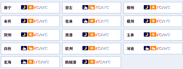 南宁市:晴间多云,东北风2~3级,最低气温9℃,最高气温18℃。