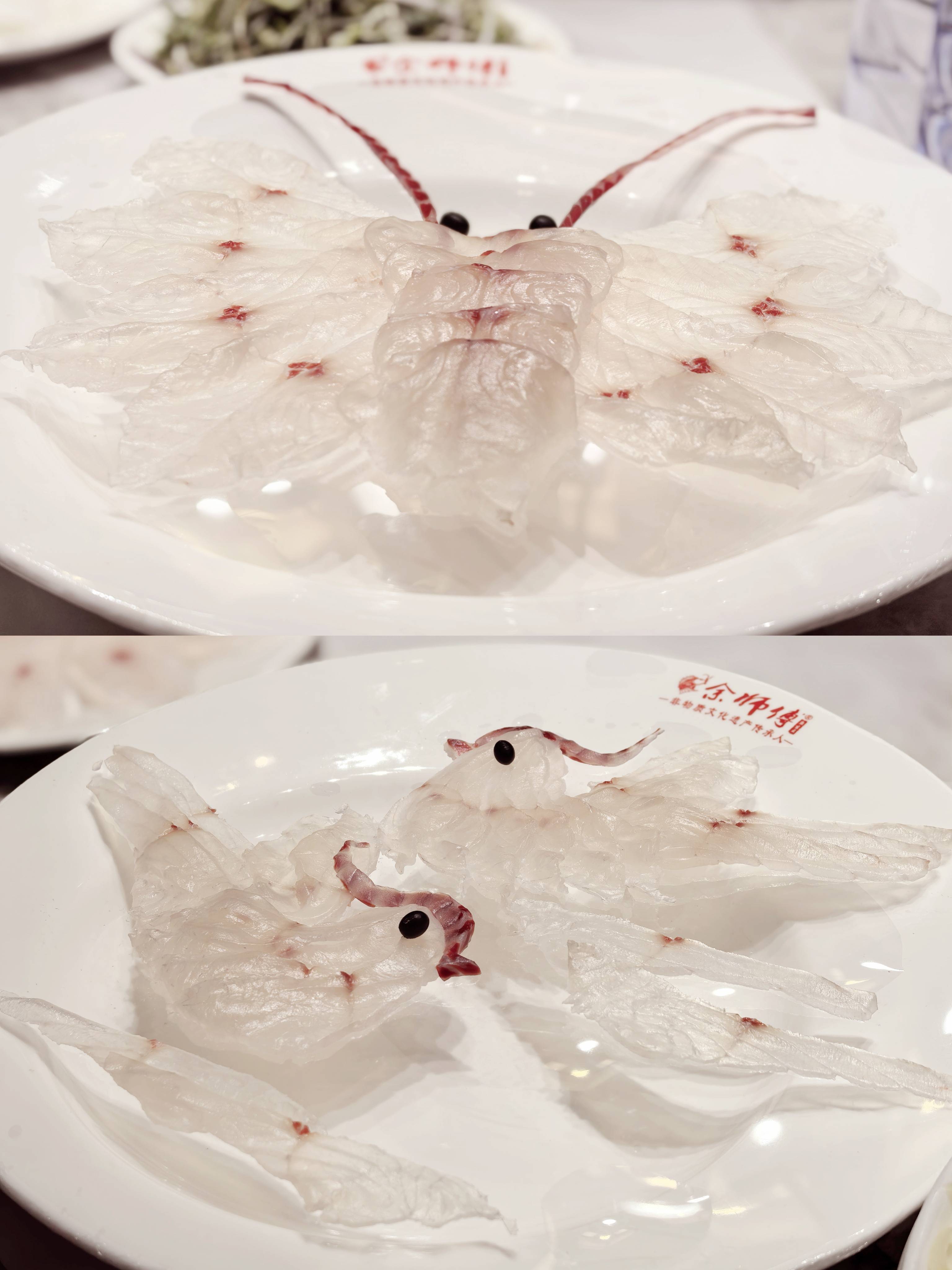 后厨里,身着白色工装的余师傅正专注地处理着一条生态金鲩鱼。他手中的刀起落如风:先给活鱼放血净身,用专用毛巾吸干水分,再沿鱼脊下刀剔出鱼肉,去皮后薄切成片。刀刃划过鱼肉的轻响中,薄如蝉翼的鱼片已然成型,展开如蝴蝶振翅,透亮得能看清纹理。“做鱼生讲究‘三精’,选料、刀工、摆设都不能马虎。”余师傅一边忙碌,一边跟身边的徒弟叮嘱,案板上,鱼腥草、紫苏叶、酸荞头、柠檬等20多种配料切得细如发丝,五颜六色码放整齐。