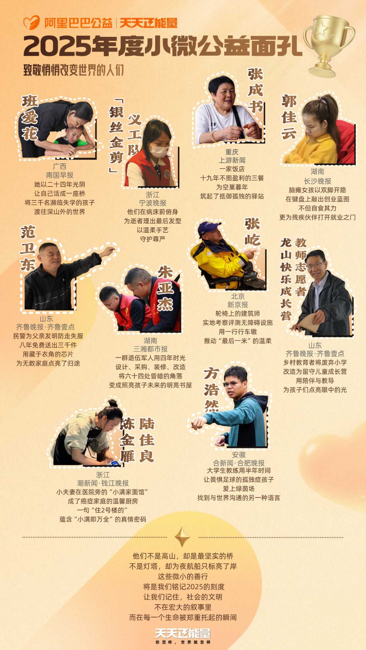“天天正能量”负责人表示,这十张(组)面孔是成千上万小微公益行动者的缩影。他们让我们看到,当每一个普通人都选择“向前一步”时,那些被遗忘的角落就会被点亮,世界的缝隙就会被缝补。