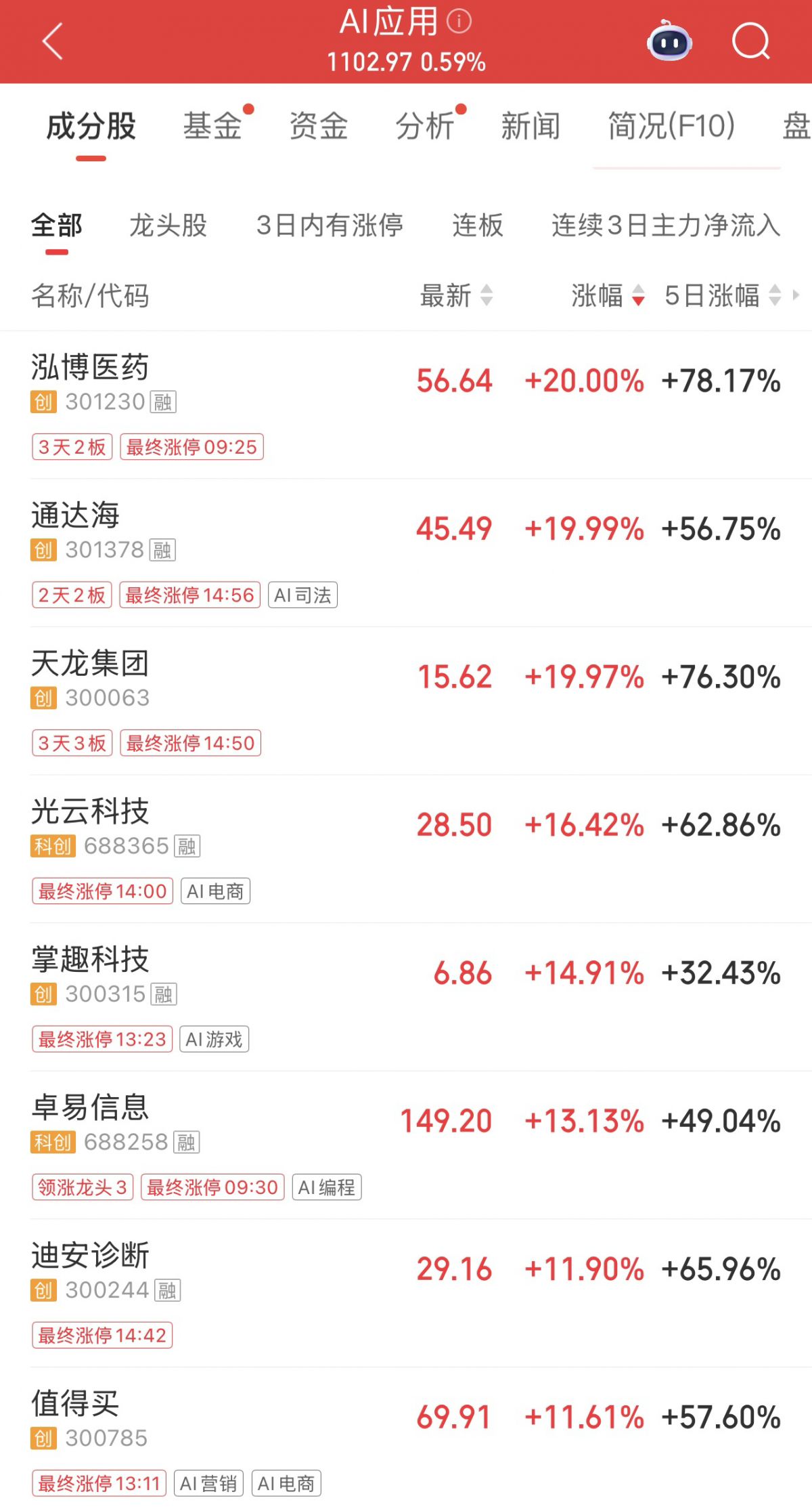具体来看,AI应用概念逆势上涨,十余只成分股涨停,天龙集团、引力传媒、利欧股份、省广集团等纷纷封板,光云科技、值得买等也涨幅居前。AI医疗概念同样表现强势,美年健康拿下3连板,泓博医药、博济医药收获20%涨停,诺思格、嘉和美康等多股涨幅超10%,整个板块多点开花。