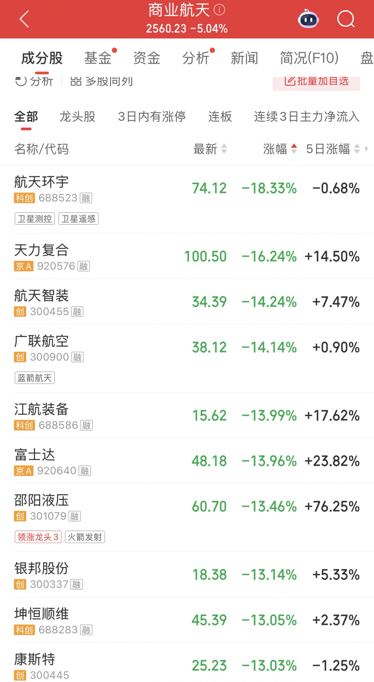 与强势题材形成鲜明对比的是,前期热门的商业航天概念股集体跳水。截至收盘,商业航天主题指数下跌超5%,盘中一度跌超8%,航天电子、航天科技、北斗星通等十余股跌停,成为当日调整最剧烈的板块。