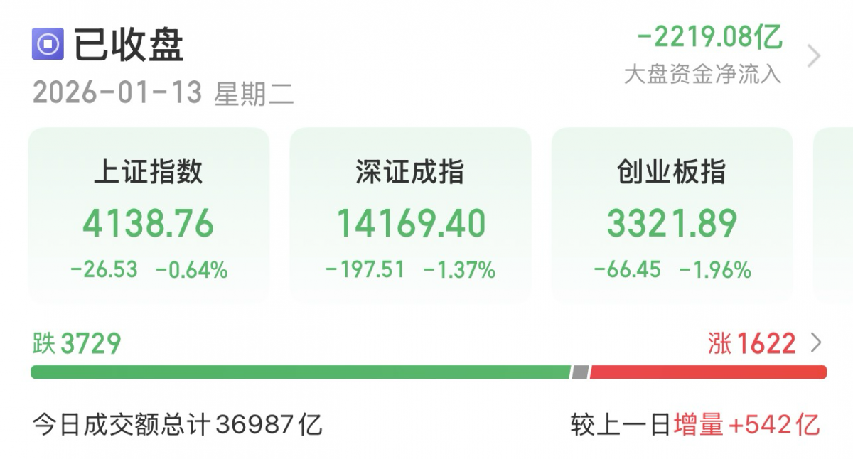 1月13日,A股全天震荡调整,三大指数集体回调,沪指跌0.64%,收报4138.76点,结束17连阳;深证成指跌1.37%,收报14169.40点;创业板指跌1.96%,收报3321.89点。
