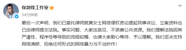 当天下午,保剑锋工作室发文回应:最后一次声明,我们已委托律师就黄女士网络侵权言论提起民事诉讼,立案资料也已由律师提交法院。事实问题,大家法庭见,不浪费公共资源。我们理解法院因其严谨性、程序性等导致的流程较慢,也请大家耐心等待,予以理解。我们坚决支持网络清朗,拒绝任何形式的网络暴力与不当炒作!
