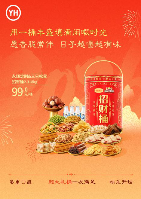 烟火家常场景最为丰富多元,永辉与多家食品品牌联手打造适合家庭消费的产品。永辉定制×三只松鼠招财桶礼盒采用半人高巨桶设计,容纳19袋精选零食,马年主题外观设计传统又时尚,成为社交媒体上的热门话题。永辉与森宝联名的“骏马献瑞”坚果礼盒,采用专利保鲜技术确保坚果口感;与五谷磨房共同研发的参芪陈皮元养粉,针对春节期间饮食特点专门配方。针对儿童群体,永辉推出灵动创想奥特曼奇迹之光礼盒,借助经典IP吸引年轻家庭消费者。