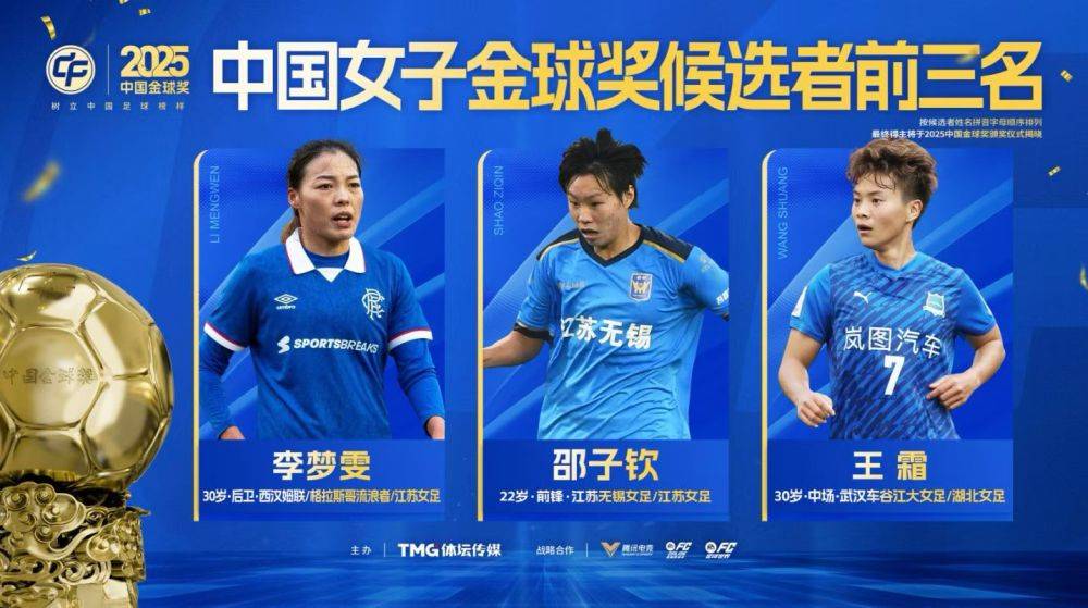 女子金球奖前三名候选人为延续旅欧生涯的李梦雯、成为中国女足年度最佳射手的邵子钦以及在多线赛场率领武汉车谷江大创造佳绩的王霜。