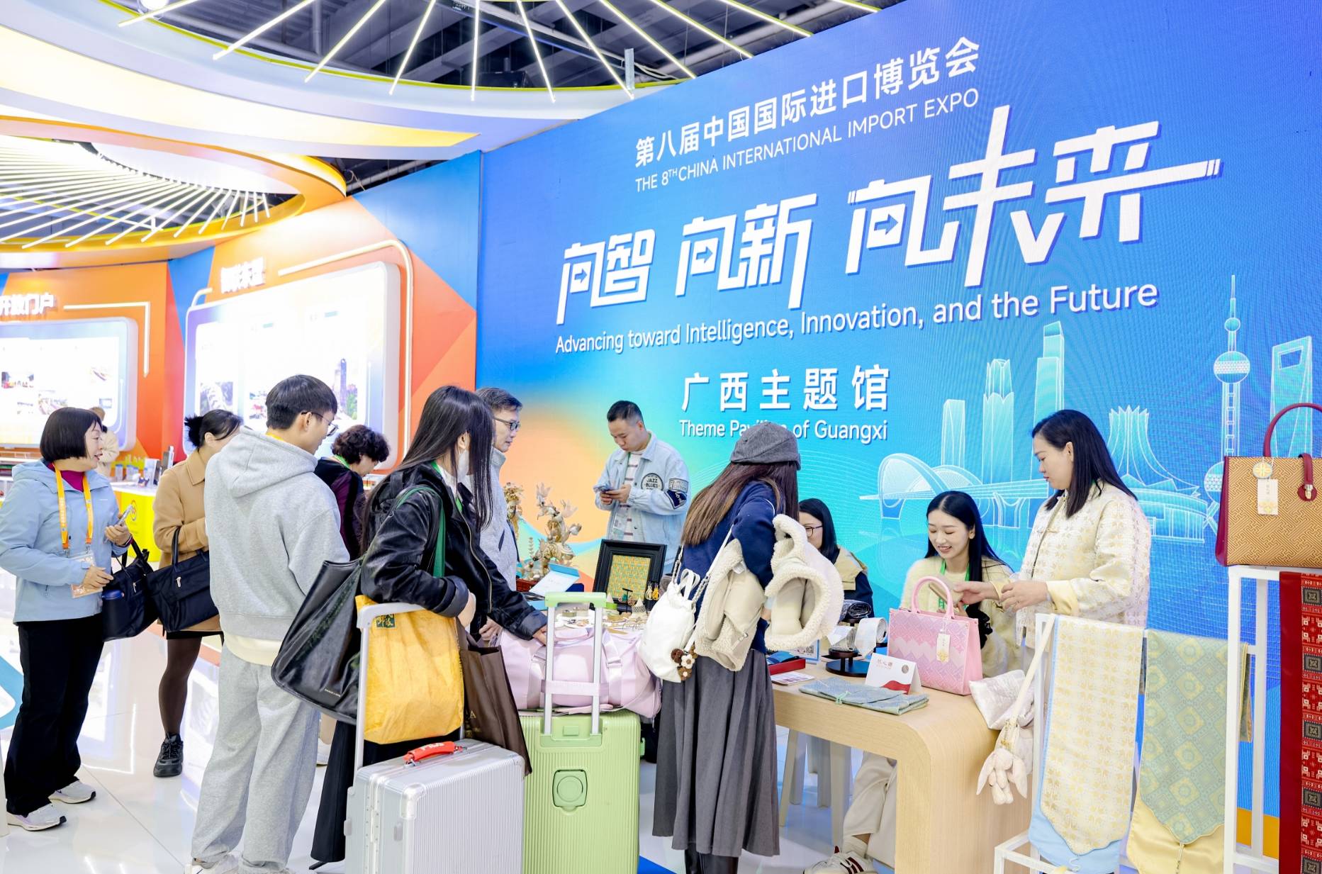此外,“十四五”期间,广西实际使用外资超额完成目标,2025年排名再进位;自贸试验区制度创新持续突破,边境口岸智慧化升级提速,中国—东盟水果输华大通道愈发通畅,2025年前11月进口东盟水果超265万吨,让市民餐桌更具“东盟味”。这些成效,为“十五五”发展奠定了坚实基础。第八届中国国际进口博览会广西主题馆。自治区商务区供图