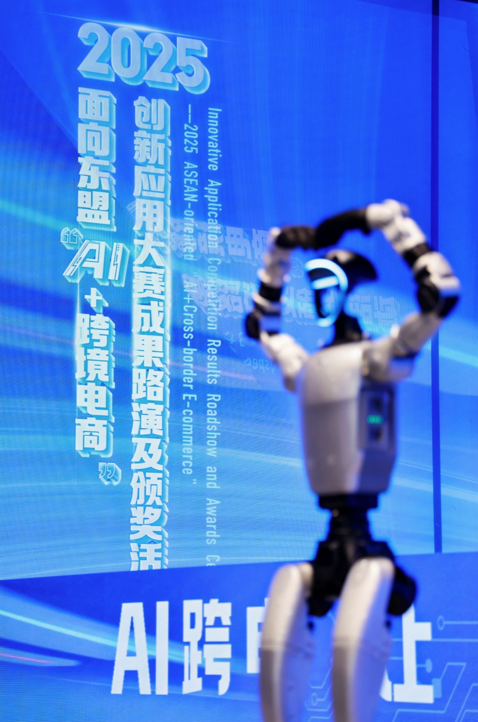 “人工智能+制造”成为最大亮点之一。2025年广西工业领域人工智能核心产业产值突破890亿元,工业版人形机器人成功下线1000台,打造应用场景291个,推动重点企业生产效率提升30%以上,践行“北上广研发+广西集成+东盟应用”发展路径成效显著。与此同时,产业转型持续提速,有色金属产业产值突破4600亿元,新能源汽车产量占比达66%,新产业新产品对工业增长贡献率超50%。2025面向东盟“AI+跨境电商”创新应用大赛成果路演及颁奖活动现场。