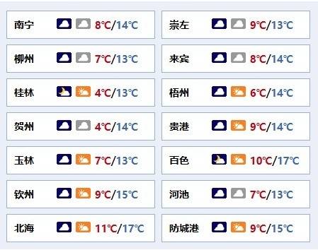 南宁市:阴天、有分散小雨,北转南风1~2 级,最低气温8℃,最高气温14℃。