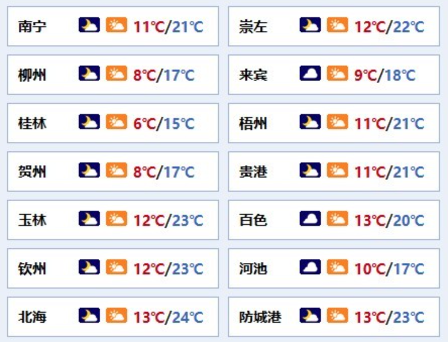 南宁市:多云,北转南风2级,最低气温11℃,最高气温21℃。