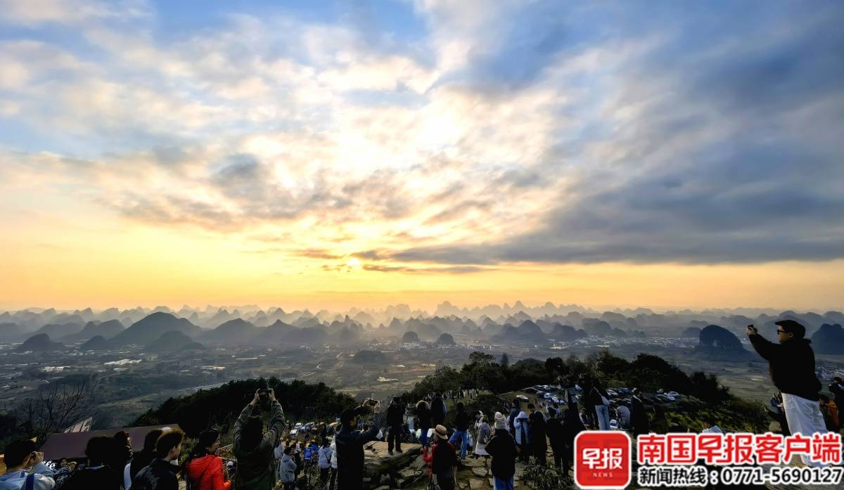 近日,桂林迎来难得的阳光好天气。在阳朔县葡萄镇的杨梅岭上,来自各地的游人打卡夕阳下的美景。【详讯】