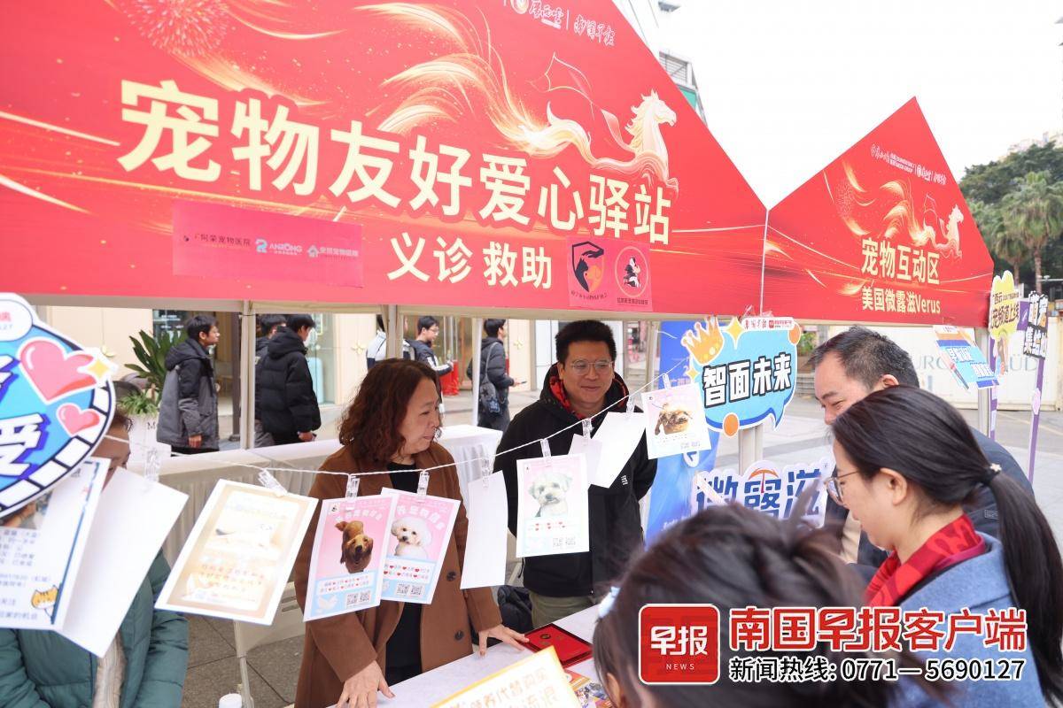 在品牌大集萌宠互动专区,广西宠物诊疗协会组织多家会员宠物医院,连续三天提供免费义诊服务;南宁市小动物保护协会开展文明养宠宣传,并公示待领养犬猫信息。此外,美国进口功能粮品牌“微露滋”为活动提供赞助,现场发放免费宠物试吃口粮500余份,传递“只喂安全,只为健康”的喂养理念。
