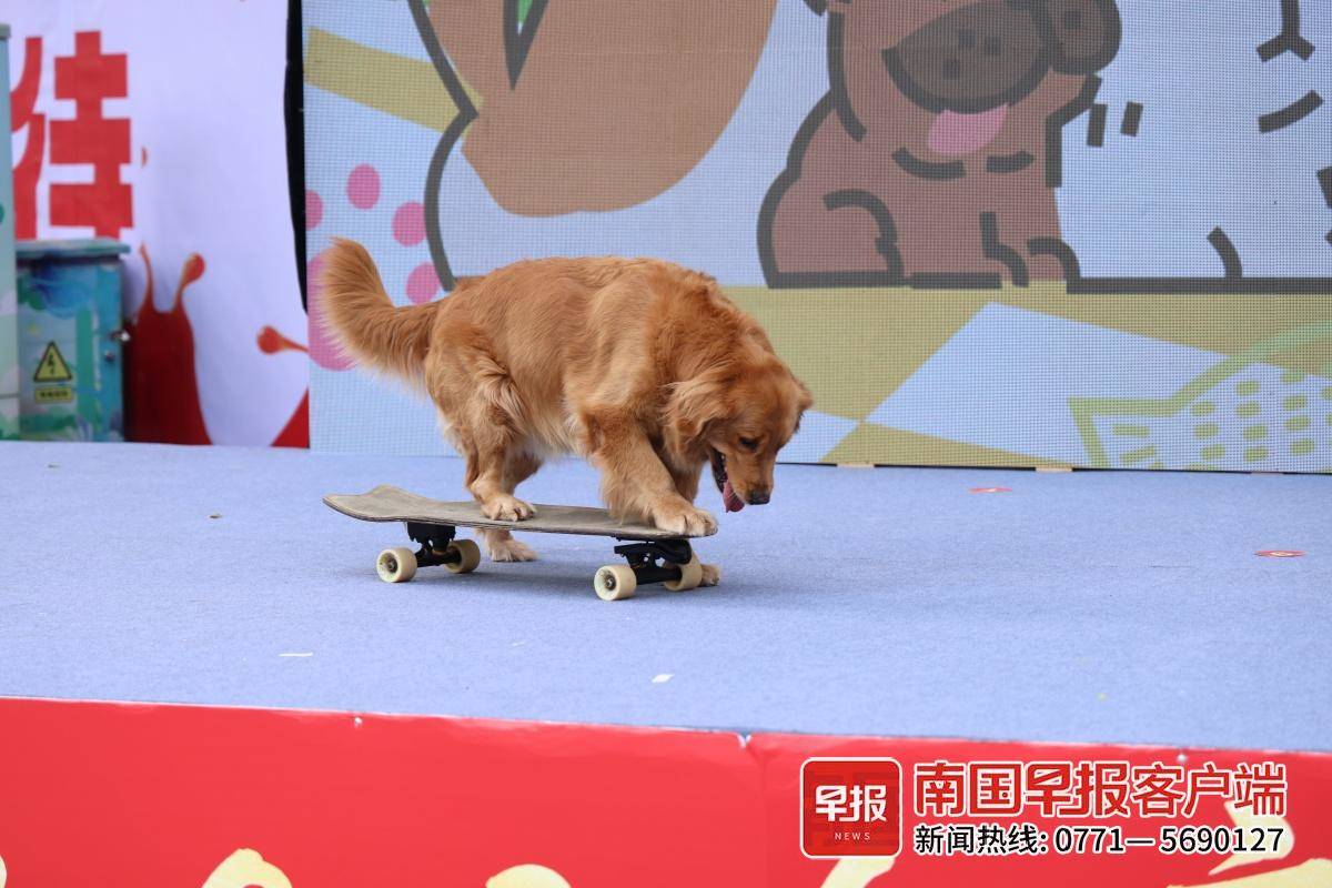 ▲金毛“爱心”是一只会踏步滑板的网红犬。
