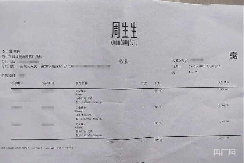 李女士说,挂坠购买后并未立即佩戴,直至1月13日晚才上身。然而,其中的足金福袋挂坠佩戴一天便被刮花并露出白色痕迹。△李女士提供的挂坠收据