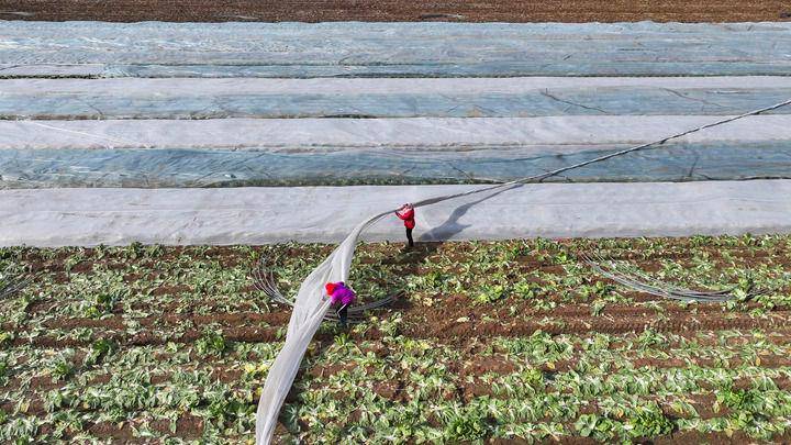 △2025年12月11日,山东东营广饶县,农民为作物覆盖防寒无纺布。