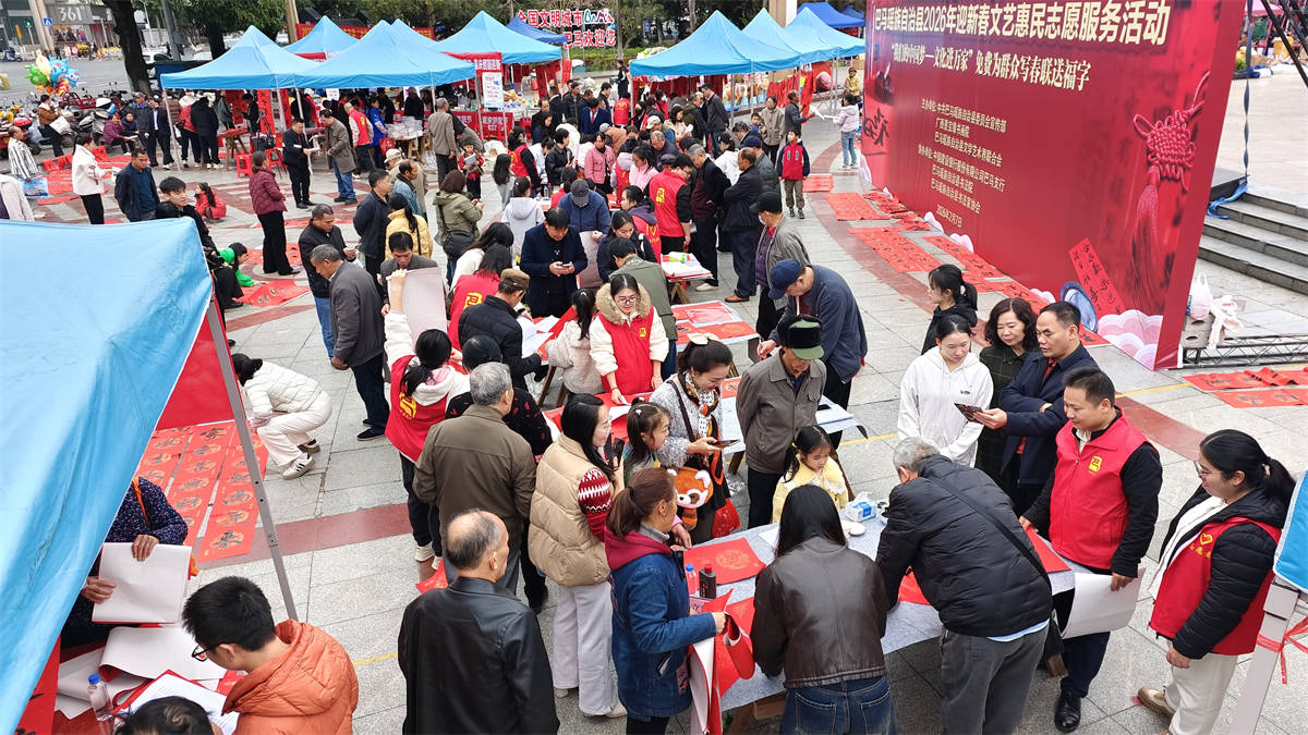红笺铺展,墨香氤氲,书法家们挥毫不停,群众有序排队、满心期盼。
