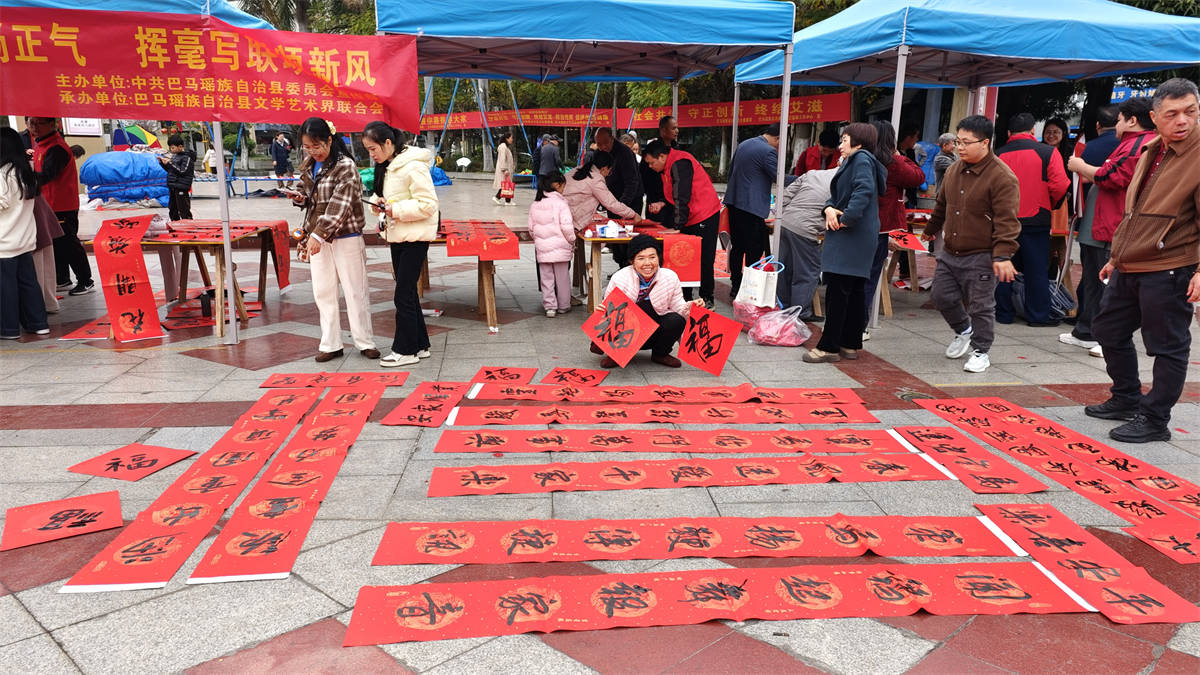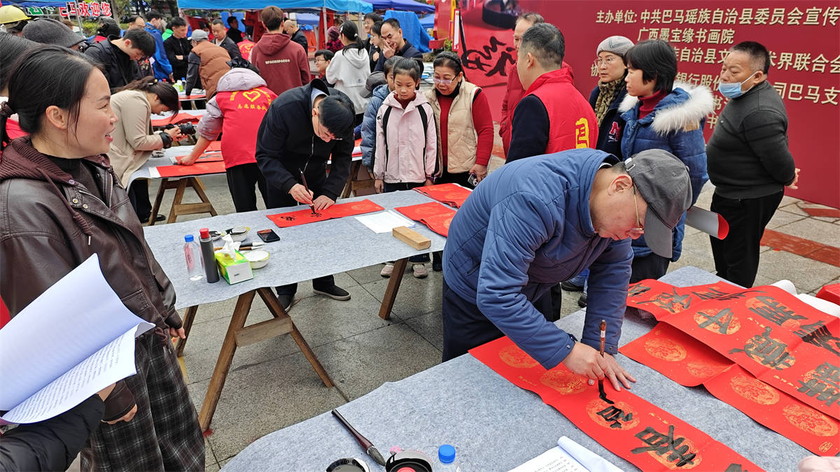 作为著名长寿之乡,巴马2009年被命名为“中国书法之乡”,书法文化深入人心。当日上午,名家们轮番挥毫、倾情创作,前来求取春联的群众络绎不绝,一派热闹祥和的新春景象。写春联、送福字现场人气爆棚、暖意融融。