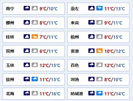南宁市:阴天有小雨,东北风2~3级、阵风5~7级,最低气温9℃,最高气温10℃。