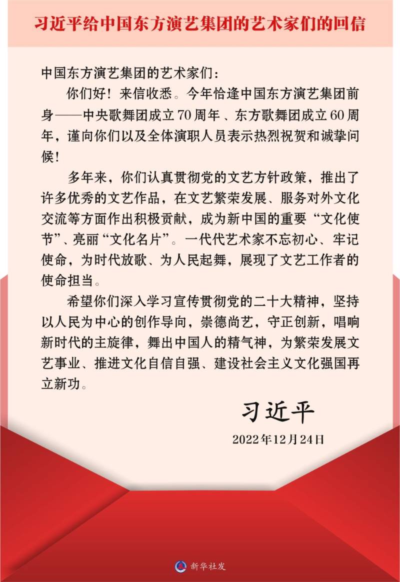 2022年,习近平总书记给中国东方演艺集团的艺术家们回信,勉励他们为建设社会主义文化强国再立新功。