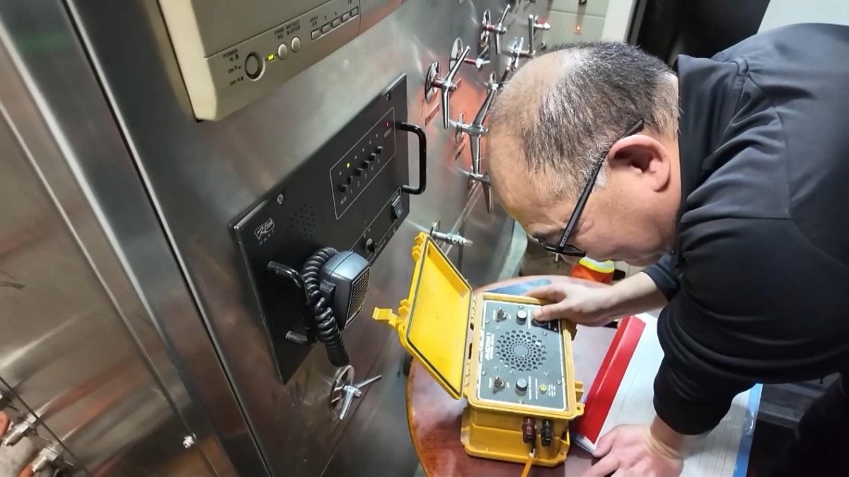 就在赵春霞和队友在减压舱内为下潜继续做准备的同时,舱外,白鹤梁水下博物馆设备管理科的吴伟有条不紊地操控着系统给减压舱加压。随着加压结束,舱内连通无压容器的底舱门自动打开。赵春霞的身影消失在了监控画面上,设备间内只能听到被放大了的呼吸声。