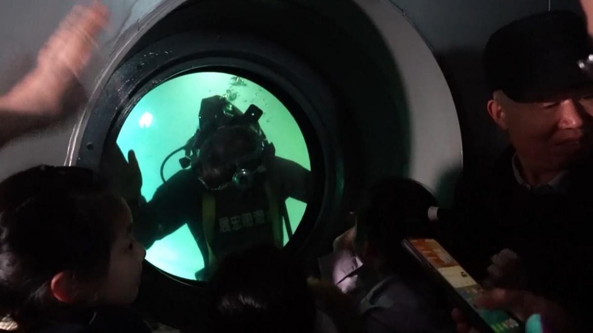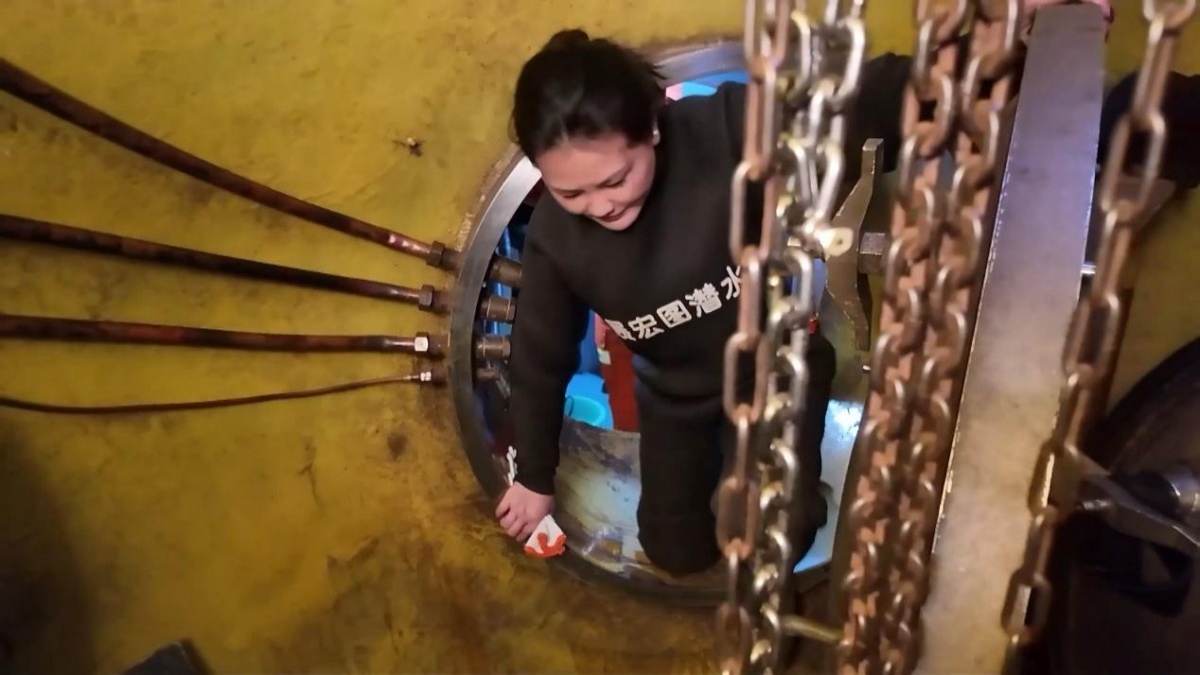 减压舱位于参观通道的一侧,不时就有游客通过。趁游客量少的时候,赵春霞和队友赶紧换好潜水服,接通了水下电话线路和空气软管。紧接着,她和另外两名队友爬进了减压舱,老队员刘吉强则在舱外负责后勤保障以及作业指挥。