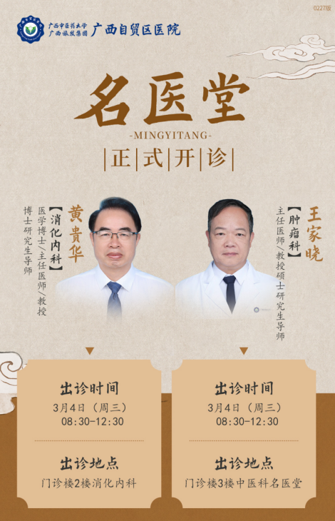 近日,广西自贸区医院精心打造的 “名医堂” 正式开诊。王家晓、黄贵华成为首批入驻专家,均于 3 月 4 日(周三)8:30~12:30 开启首次出诊。