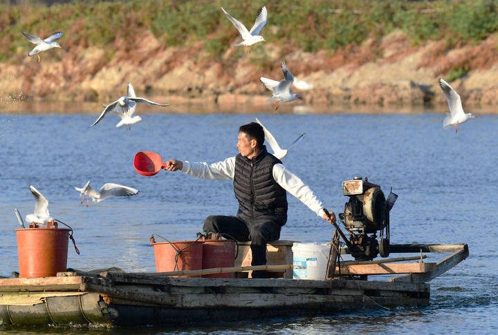 2025年12月10日,福建省漳州市佛昙镇东坂村河豚养殖户在给河豚投喂食物。新华社记者 魏培全 摄