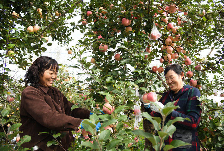 2025年10月17日,果农在陕西省延安市宝塔区桥沟街道烟洞沟村采收苹果。新华社记者 张博文 摄