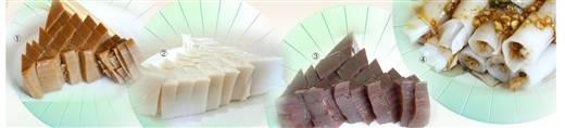南康水籺主要有红糖籺(图①)、米籺(图②)、薯粉籺(图③)、卷筒籺(图④)等。 图源广西云