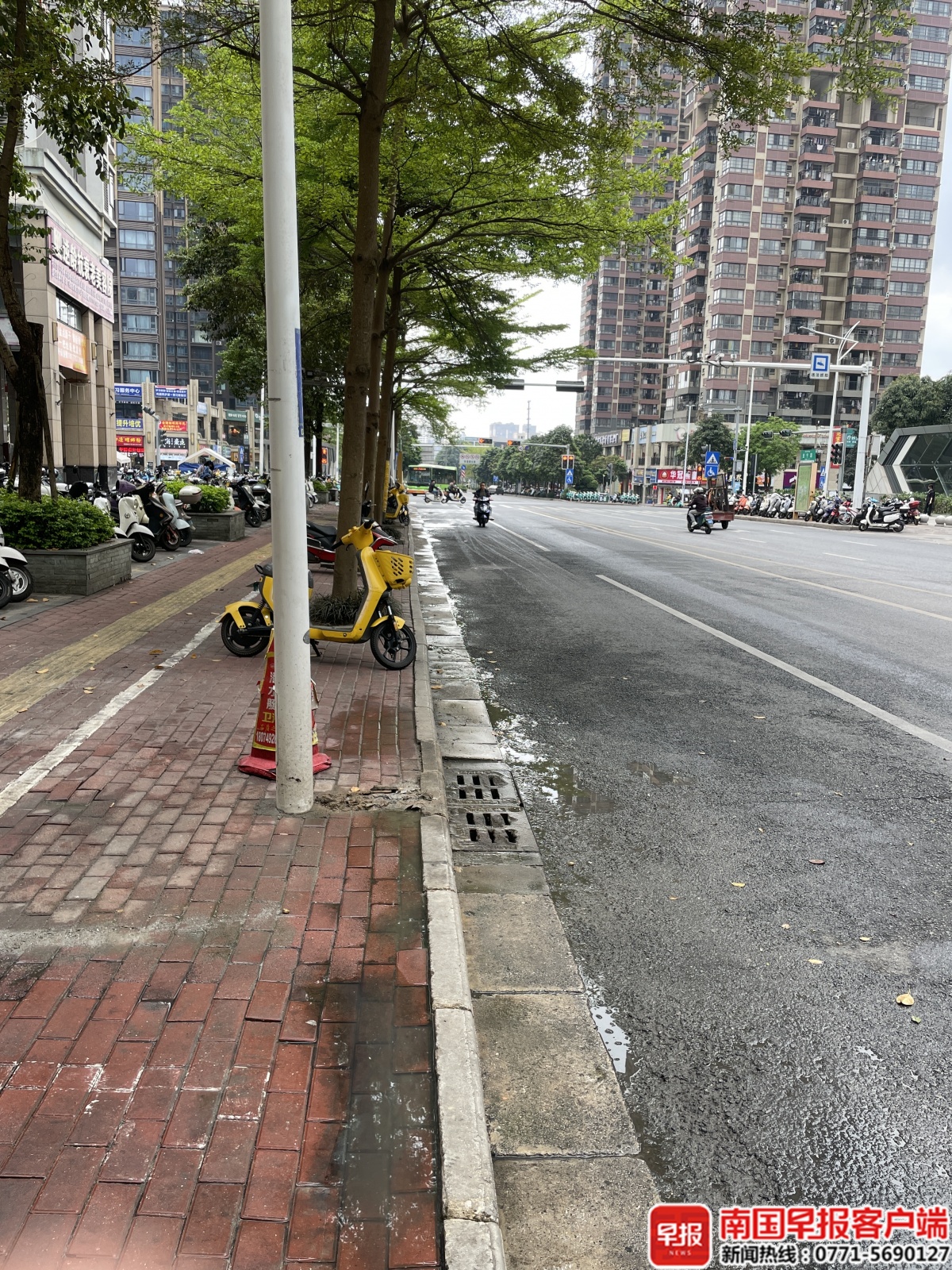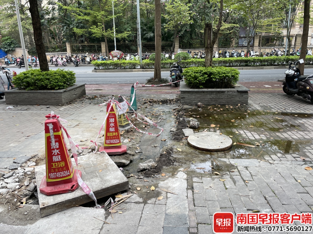 3月16日下午,南国早报全媒体记者走访现场发现,陈先生所反映的金宁路临街商铺旁的人行道区域,由于长期渗漏污水,井盖周边已出现轻微异味,地面青苔滋生,部分路面砖块有明显翻动痕迹。井盖旁拉起警戒线,立有“正在处理,请勿靠近”的提示牌。
