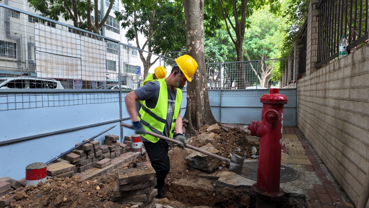 工人将盲道上的消防栓挪到树池边。